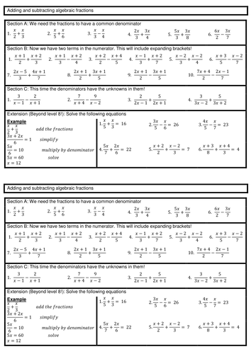 Adding Algebraic Fractions Lesson Plans Worksheets