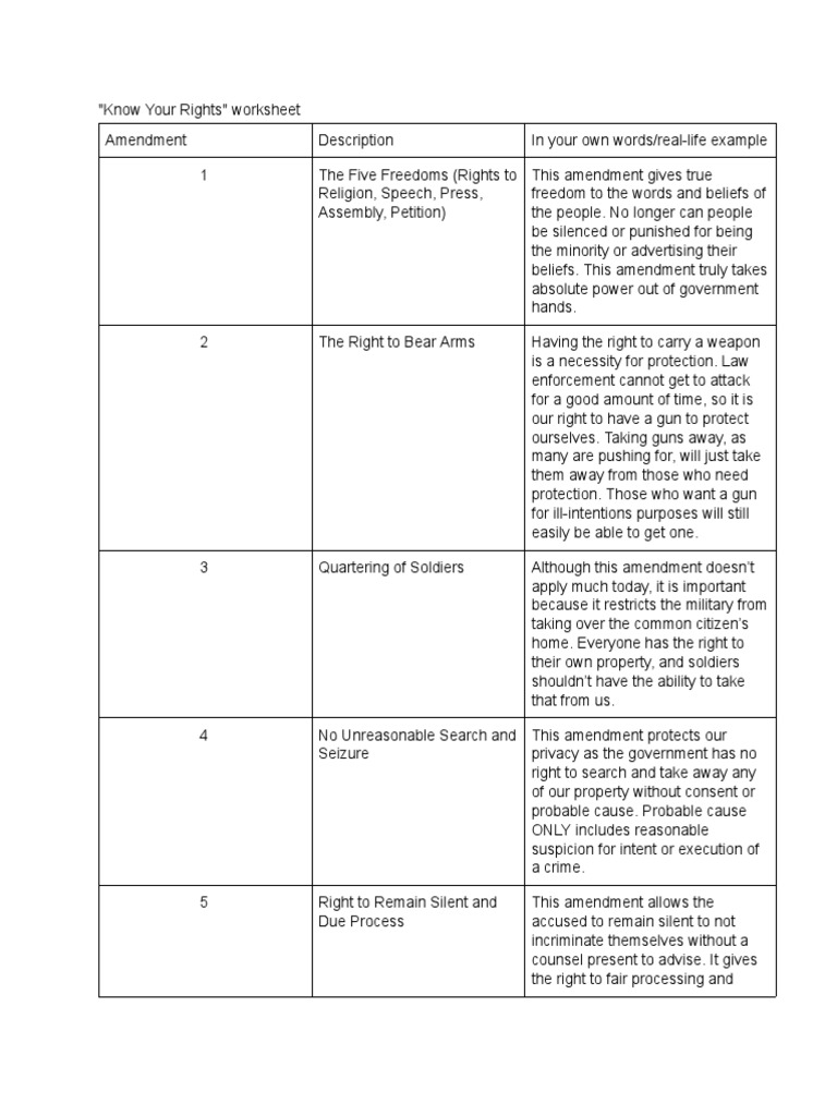 How Well Do You Know Your Rights Worksheet Each Statement On The