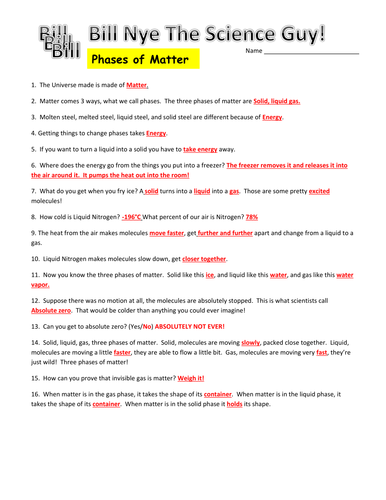 Bill Nye Phases Of Matter Video Worksheet Teaching Resources